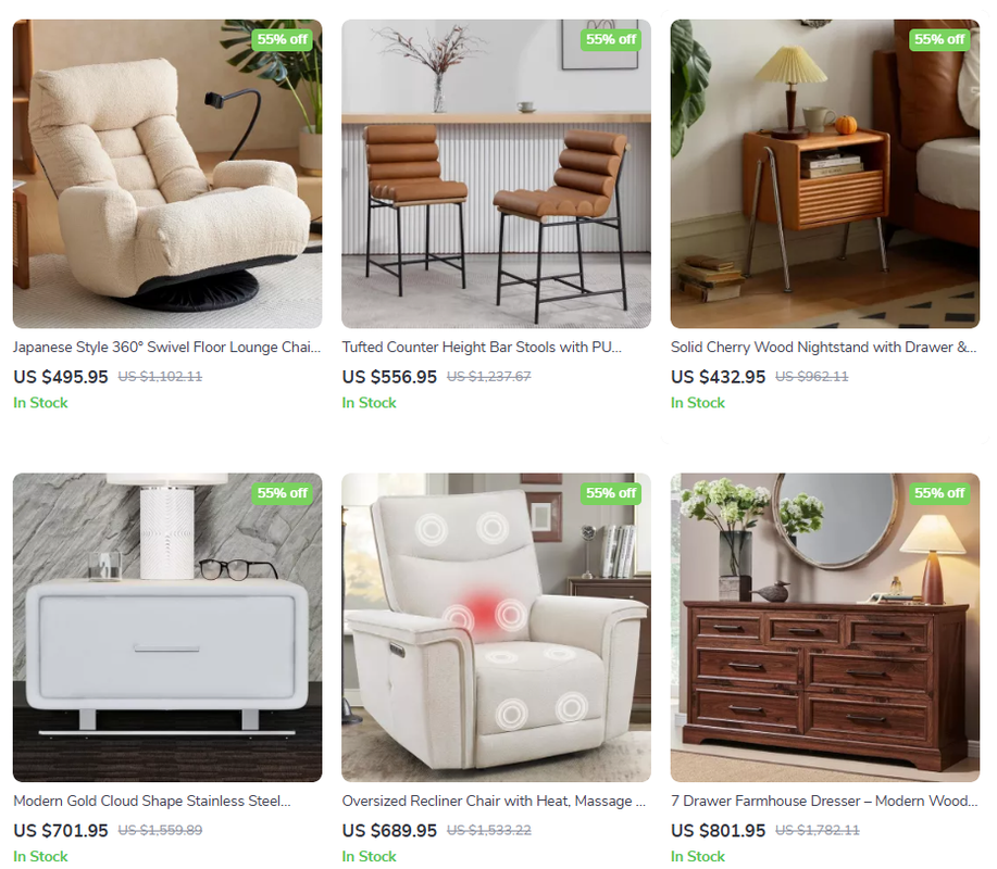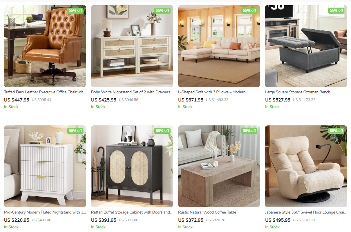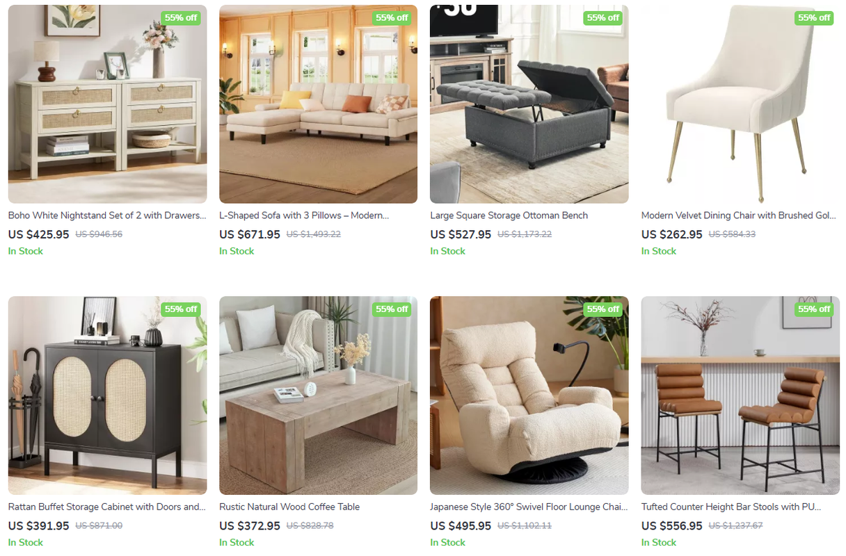 Casa Furniture USA specializes in affordable luxury, with sofas and beds featuring tufted designs and chrome accents. Free delivery nationwide ensures pieces like king-sized platform beds arrive ready-to-use, priced at $800-$1,200.